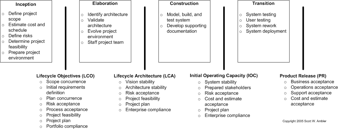 | 1. Inception | To identify the initial scope of the project, a potential architecture for your system, and to obtain initial project funding and stakeholder acceptance. | Lifecycle Objectives (LCO) |