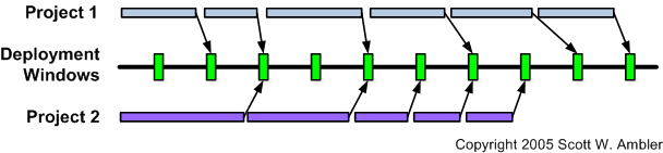 Figure 3 depicts how you will need to schedule the deployment of your application into pre-defined deployment windows, shown in green. A deployment window, often called a release window, is a specific point in time where it is permissible to deploy a system into production. Your operations staff will very likely have strict rules regarding when application teams may deploy systems. Figure 3 shows how two project teams schedule the deployment of their changes (including database refactorings) into available deployment windows. Sometimes there is nothing to deploy, sometimes one team has changes, and other times both teams have schema changes to deploy. You will naturally need to coordinate with any other teams which are deploying during the same deployment window. This coordination will occur long before you go to deploy, and frankly the primary reason why your pre-production test environment exists is to provide a sandbox in which you can resolve multi-system issues.