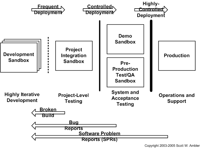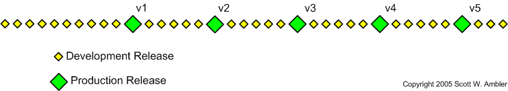 AUP teams typically deliver development releases at the end of each iteration into pre-production testing and/or demo staging area(s) (see Figure 1). A development release of an application is something that could potentially be released into production if it were to be put through your pre-production quality assurance (QA), testing, and deployment processes. Granted, this won’t be true earliest development releases because you won’t have delivered sufficient functionality to make deployment worth your while. Furthermore at the beginning of a project you often stub out interfaces to shared services – such as security, persistence, or even reusable legacy functionality – so technically you still have some clean up to do before you’re ready to release to production.
